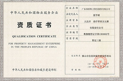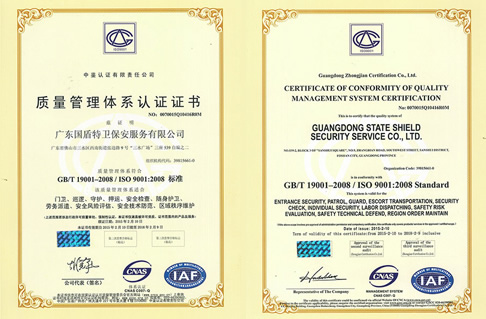 ISO9001管理體系認證,佛山市A級重合同守信用企業,廣東保安協會會員。